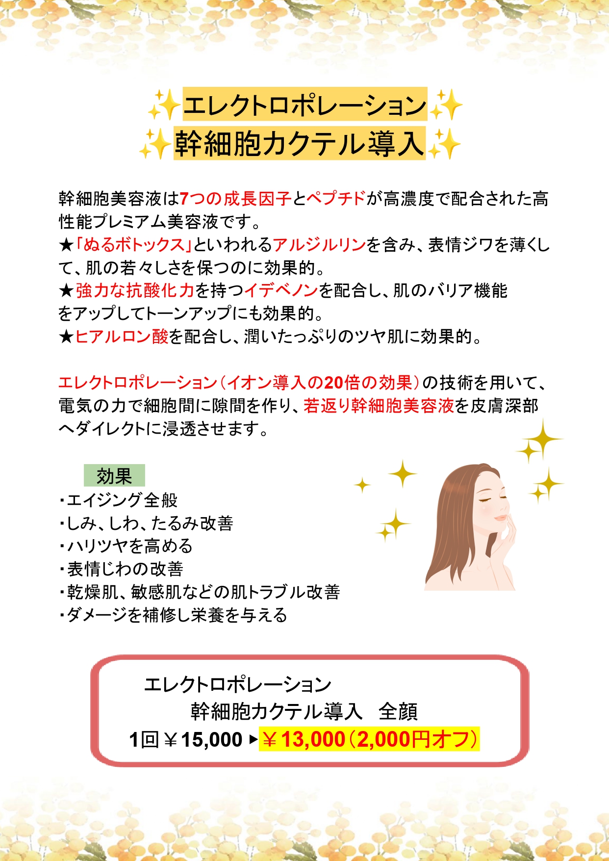 | 【同日に組み合わせ可能なメニュー】 エレクトロポレーション(しょうこオリジナルカクテルのみ)、ハイドラジェントル、顔以外のメニューが可能 |